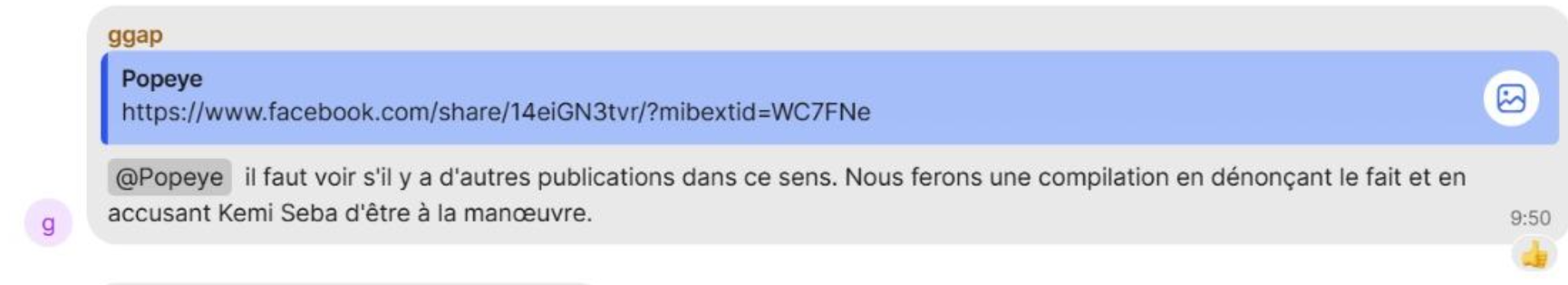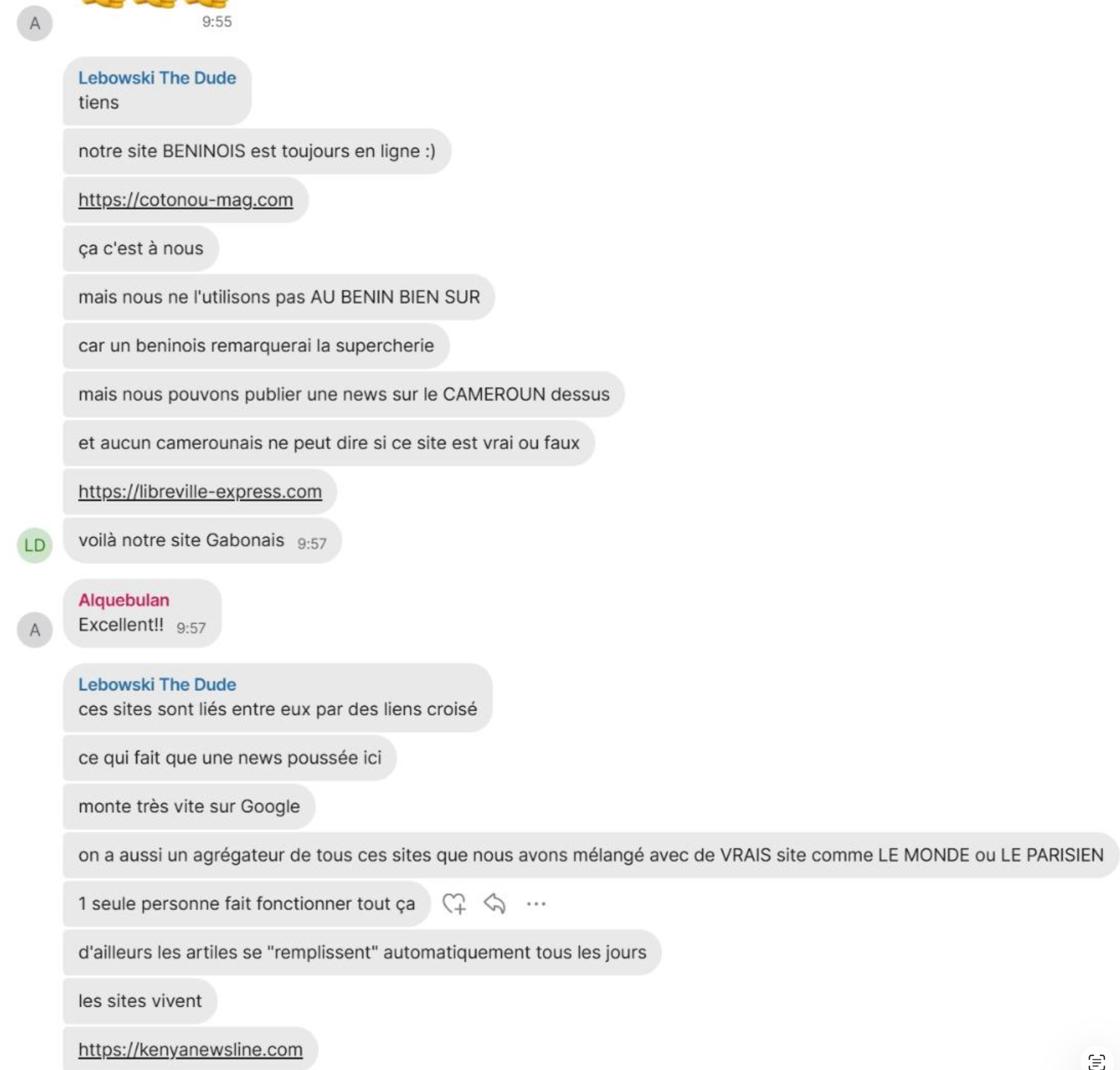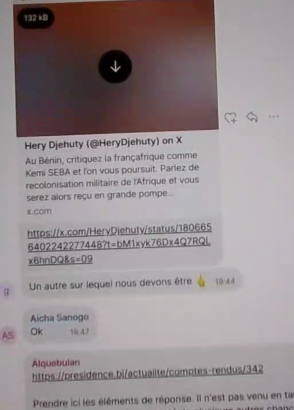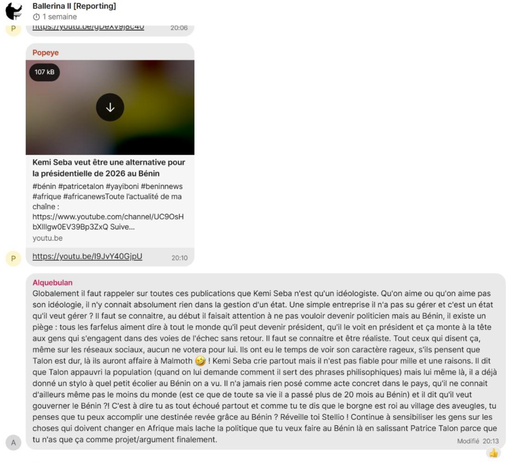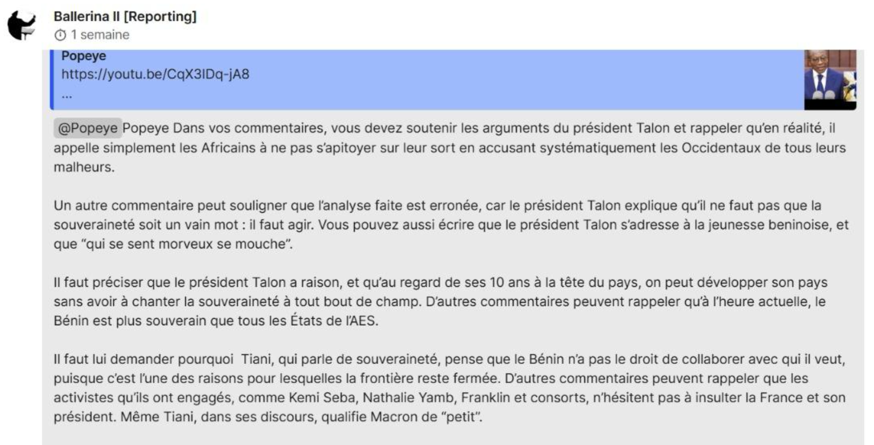 À l'inverse, il proposait des contenus à destination d'influenceurs payés pour défendre le régime et qualifiés couramment de "klébés", louant les initiatives diplomatiques de l'État béninois et ses "succès locaux", à Sètovi et ailleurs.
