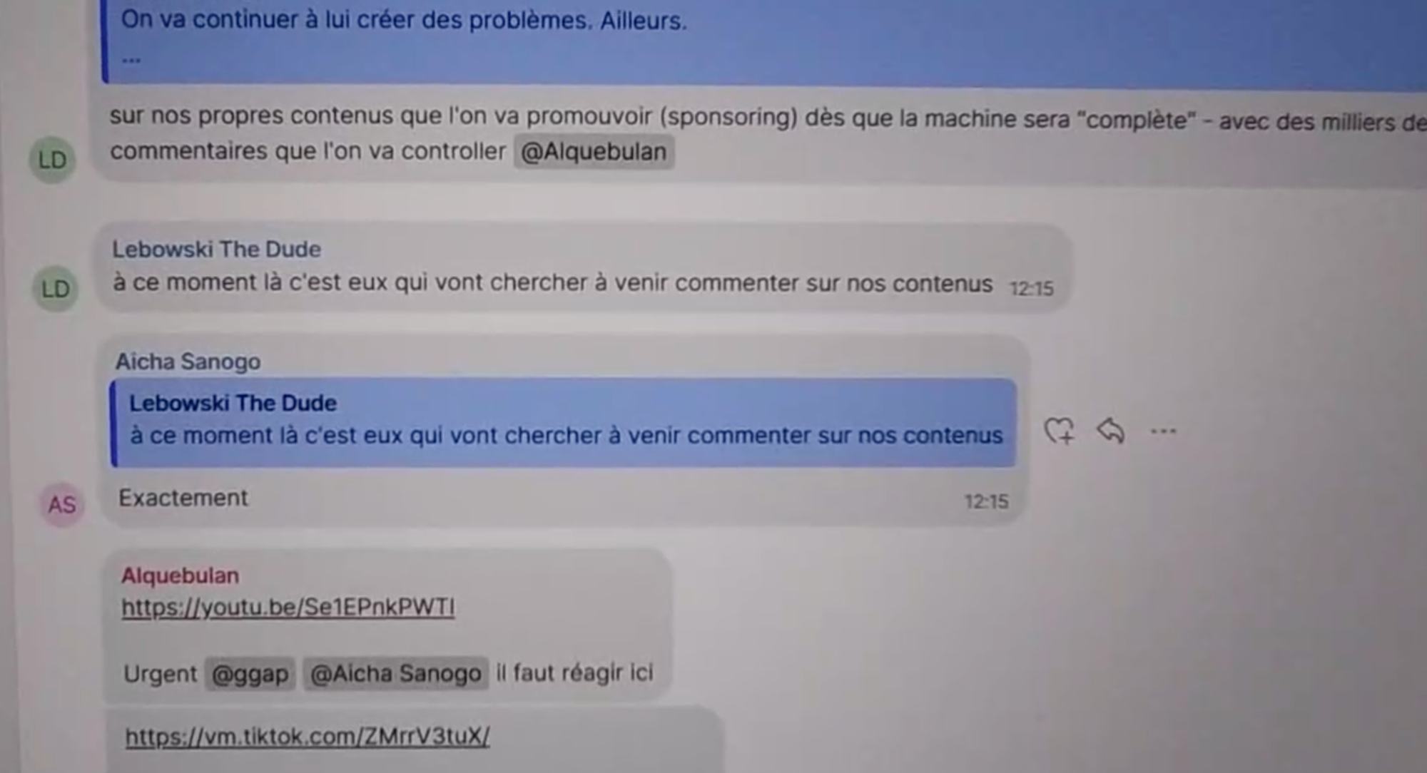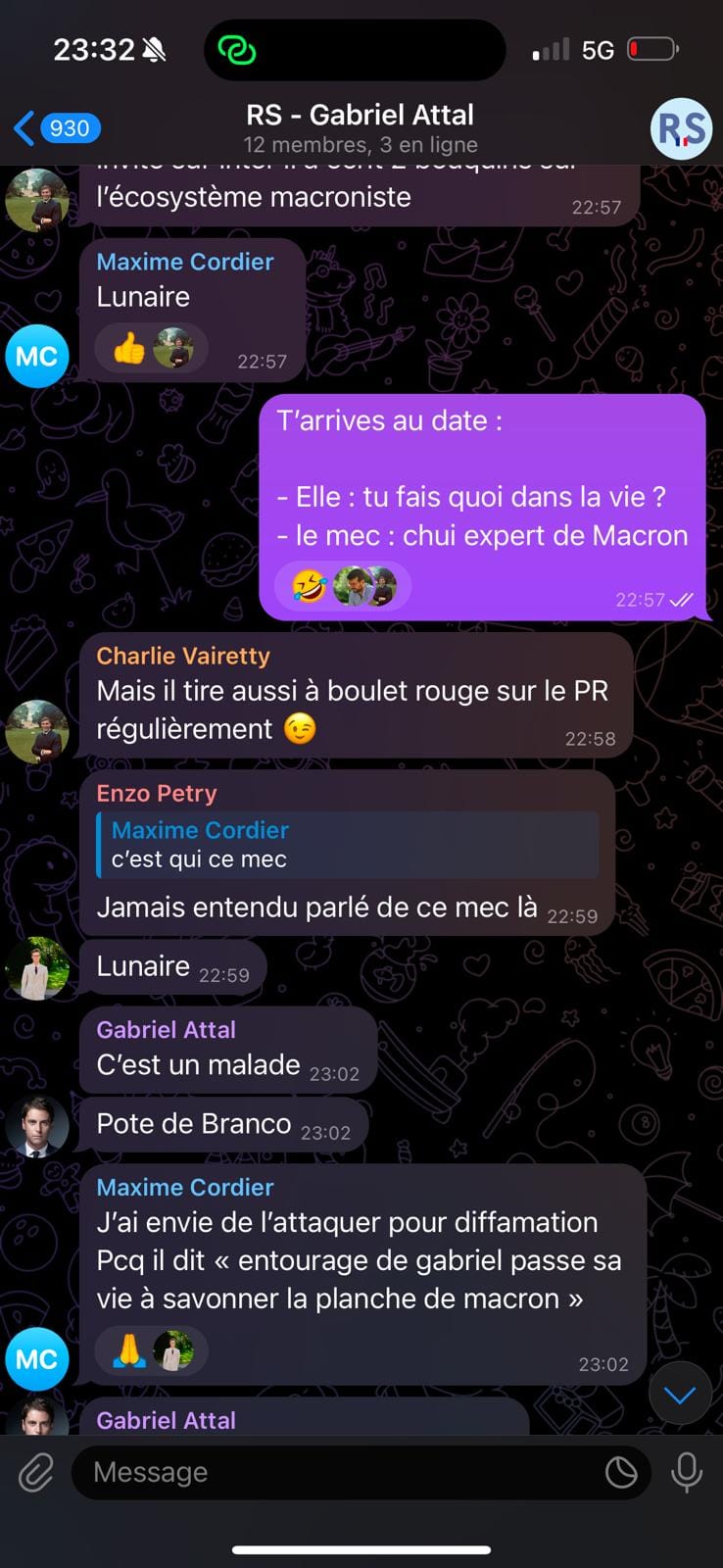 C'est ainsi que les conseillers en communication de Gabriel Attal, Pierre-Louis Tanzer et le "conseiller aux affaires réservées", désormais candidat du parti présidentiel à la mairie du 6e arrondissement de Paris, Antoine Lesieur, sur leur temps de travail, payés par Matignon et utilisant à cette fin les moyens de l'État, étaient missionnés pour obtenir d'Alertes Infos une reprise des fausses allégations, insistant afin d'obtenir des reprises et proposant, en retour d'un traitement favorable, divers services, allant de visites à des intermédiations afin d'obtenir le rachat de leurs comptes par des intermédiaires divers, créant des galaxies d'influenceurs prêts à être mobilisés dans la perspective de l'élection de 2027.