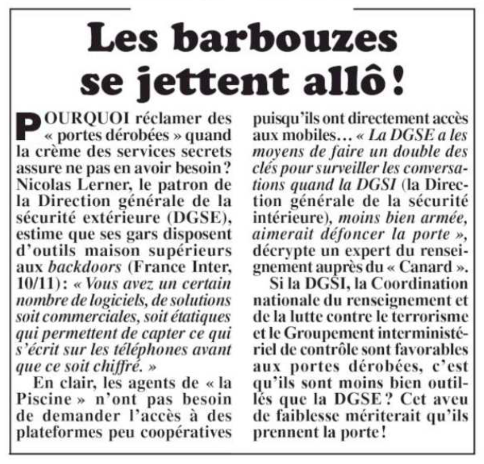 La France fait elle-même appel à des solutions d'espionnage et de traitement de données étrangères. Sous dépendance de la CIA, la DGSI travaille avec PALANTIR, une société dirigée par Alex Karp qui n'hésite pas à revendiquer sa contribution à des assassinats ciblant des opposants aux pouvoirs états-uniens. La DGSE, elle, dispose d'instruments similaires à ceux de BOLD, et n'hésite pas en faire usage, comme le rappelait encore cette semaine le Canard enchainé.