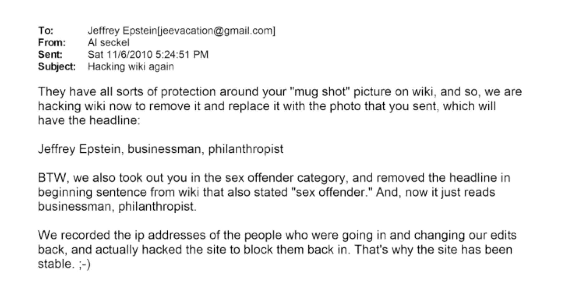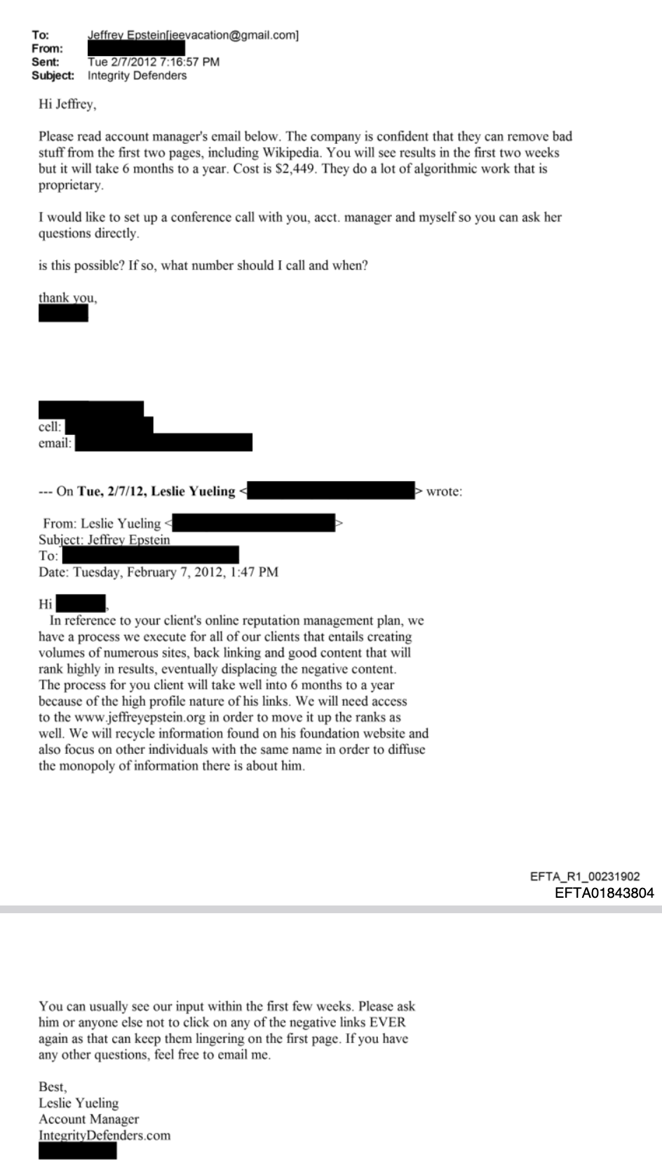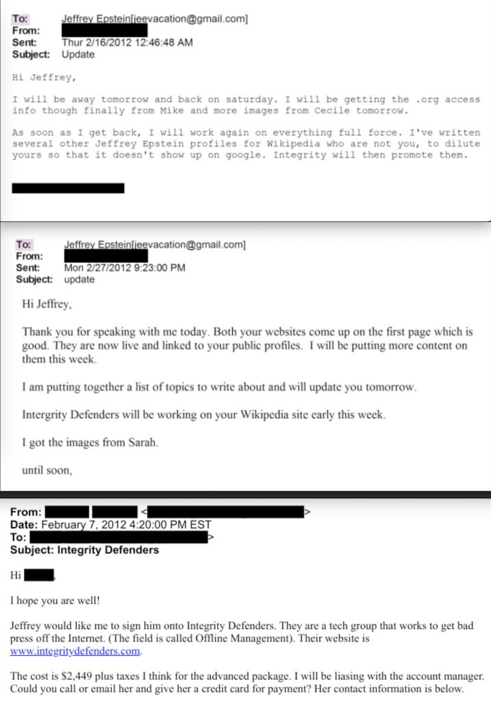 C'est ainsi que Jeffrey Epstein procédait, payant jusqu'à 100.000 dollars par an à différents intermédiaires, dont une agence nommée "Integrity Defenders" (sic) chargée de s'en occuper, en sus d'un travail sur le référencement sur Google. Ainsi, pendant des années, toute référence à sa condamnation pénale pour agression sexuelle a été effacée.